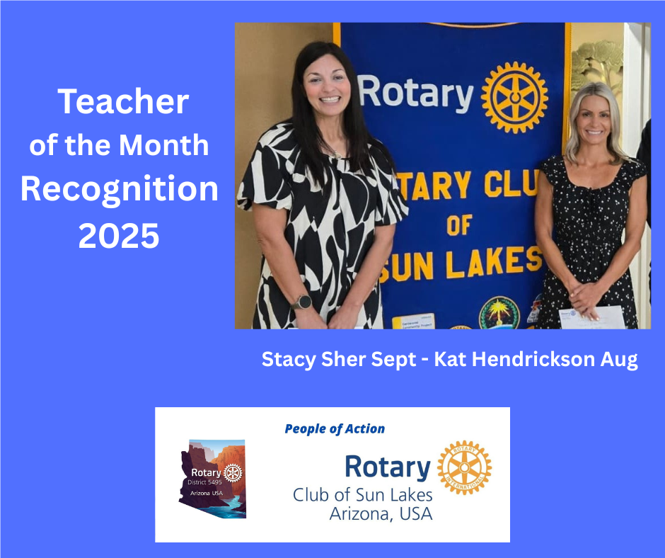 The Rotary Club of Sun Lakes (RCSL) named Kat Hendricksen August 2025 RCSL Teacher of the Month. Coach Hendricksen is Physical Education teacher at CUSD Carlson Elementary School. Coach Hendricksen has over 13 years of teaching experience after earning her Bachelor of Education degree at Northern Arizona University.