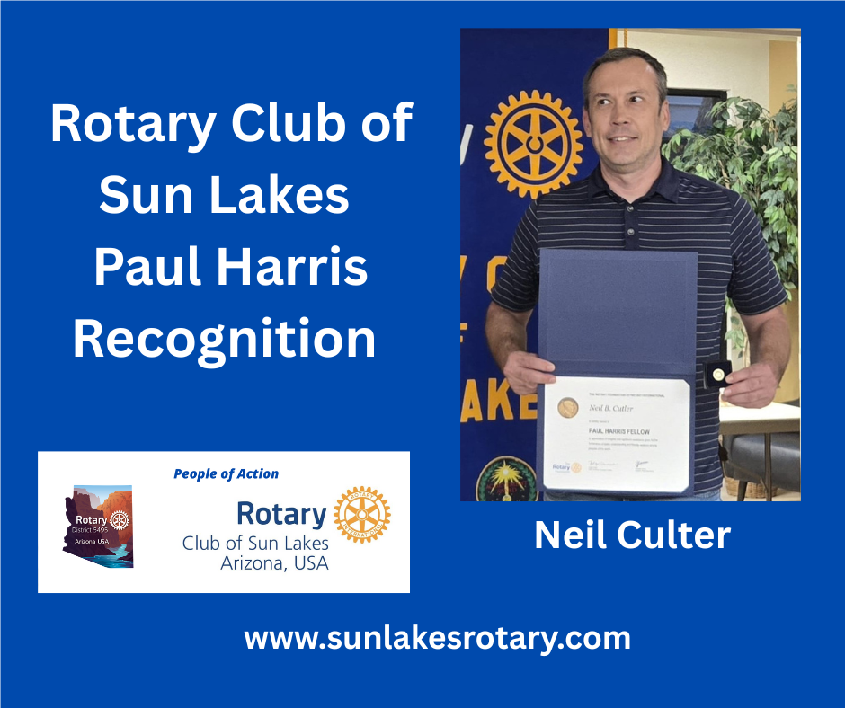 Rotary Club of Sun Lakes member Neil Cutler was honored for his philanthropic gifts to the Rotary Foundation. The Rotary Foundation transforms Rotarian’s gifts into service projects that change lives both USA and around the world. The Rotary Foundation helps Rotary members to advance world understanding, goodwill, and peace by improving health, providing quality education, improving the environment, and alleviating poverty through local, domestic, and international service projects. The Paul Harris Fellow recognition acknowledges individuals who contribute or have contributions in their names to The Rotary Foundation.
